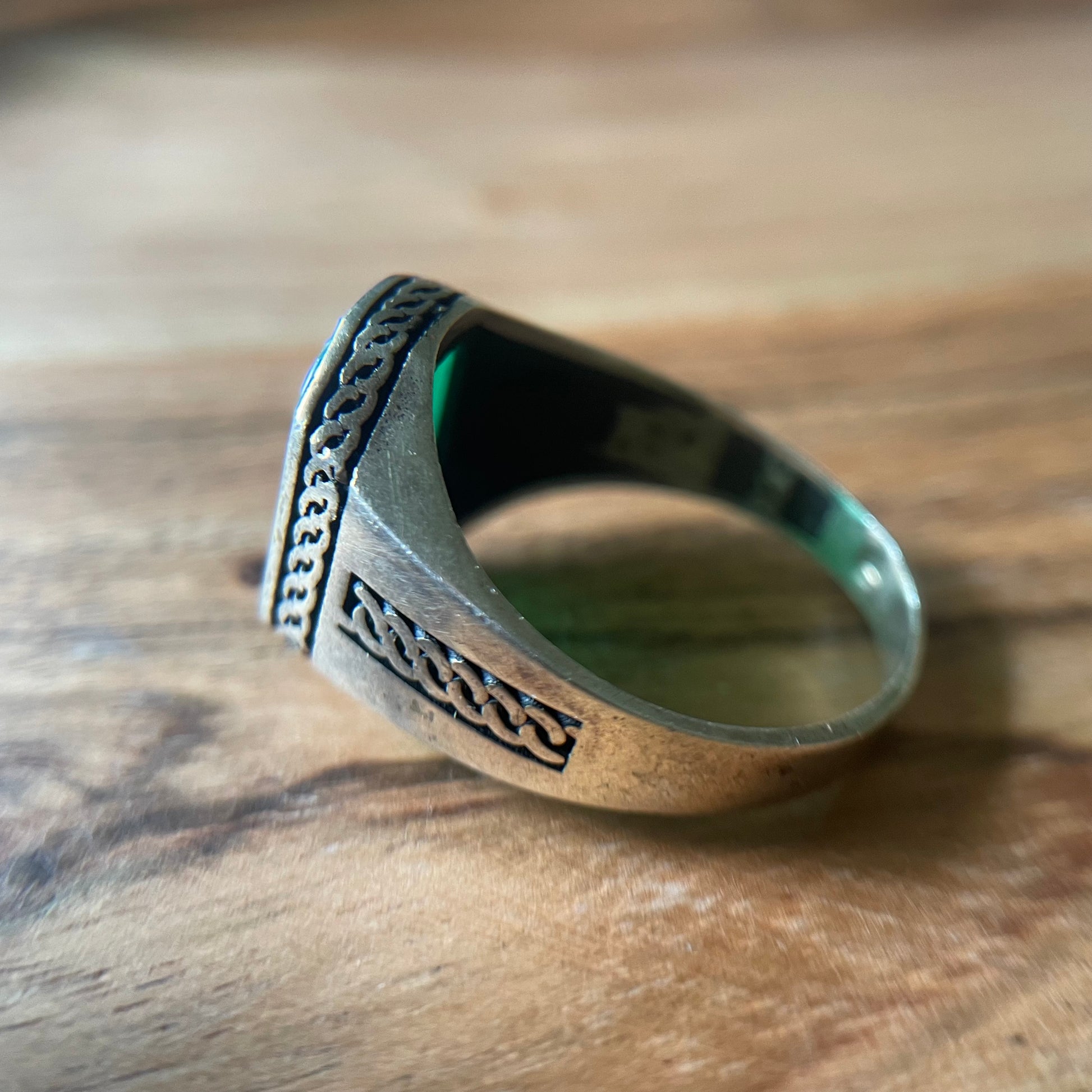 Prachtige stoere 925 zilveren zegelring met groene doorzichtige edelsteen.